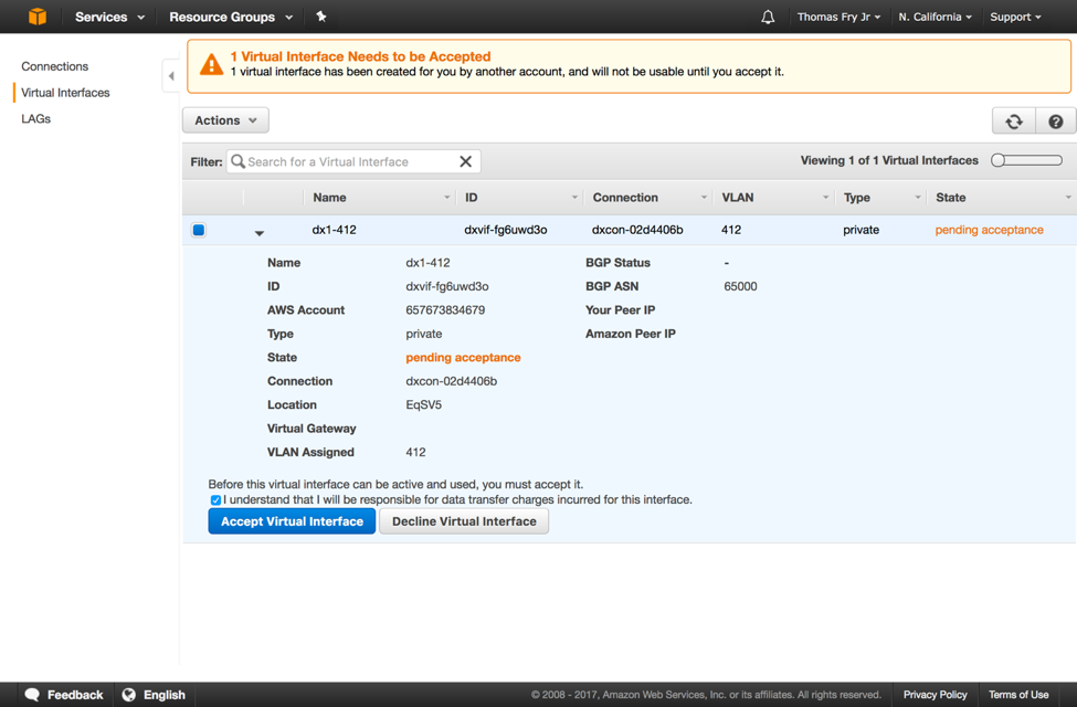 After you accept the virtual interface, the state will change to pending while AWS completes the request.
