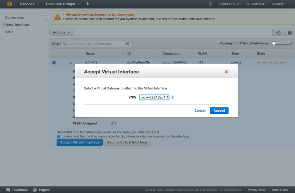 - Select the AWS virtual private gateway to use for this connection and click Accept.