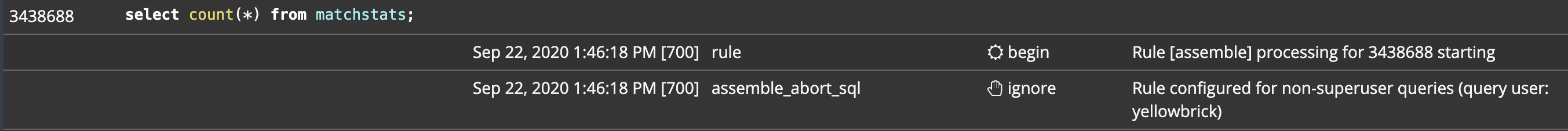 w.abort('Flex profile: ybsql users cannot query match tables!');