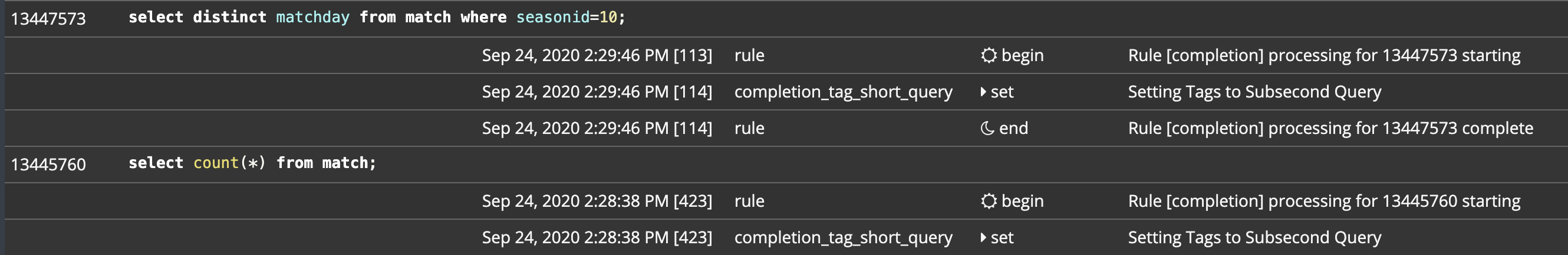This completion rule, completion_warn_yellowbrick_user, tracks all of the queries run by the yellowbrick account and logs a warning message.