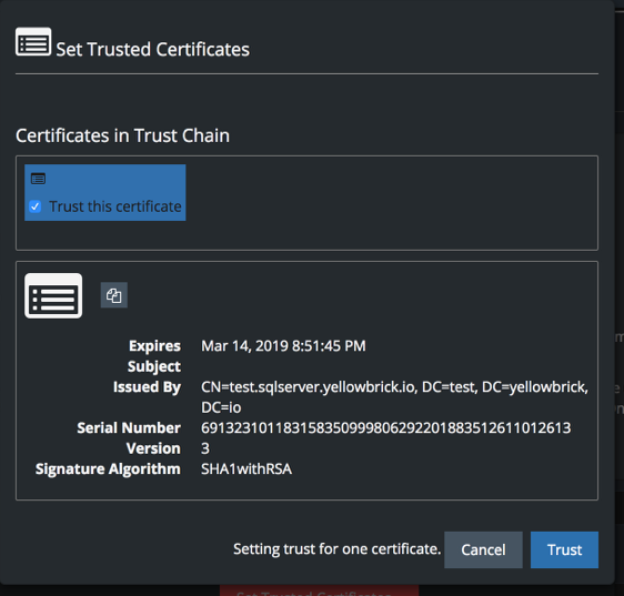When a secured protocol (SSL or TLS) is used to exchange information with an external LDAP directory, Yellowbrick must establish trust using the public certificate for the external directory. To establish trust, import one or more certificates for the external directory or the signing root and intermediate certificates for the external directory. A full certificate chain must be installed; intermediate certificates by themselves are not sufficient to establish trust.