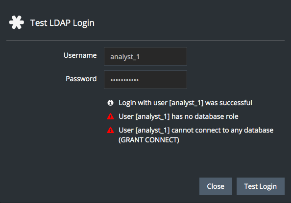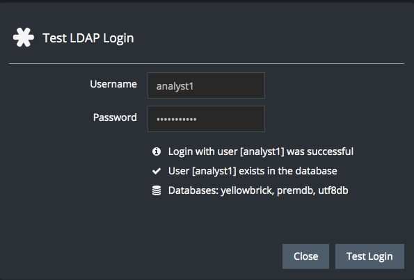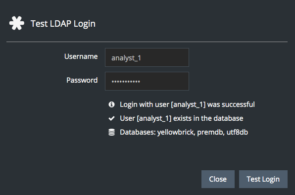 analyst1@test.yellowbrick.ioThe LDAP test login will succeed, and if analyst1 exists in the database, the login will return no warnings: