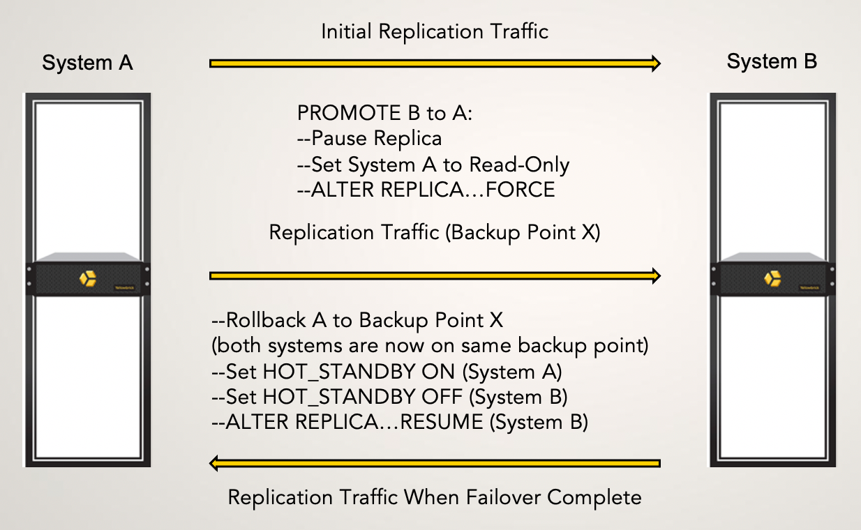 When you are ready, you can revert to the original replication setup, from ybwest to ybeast. All you need to do is run a PROMOTE command that fails back to the primary system.