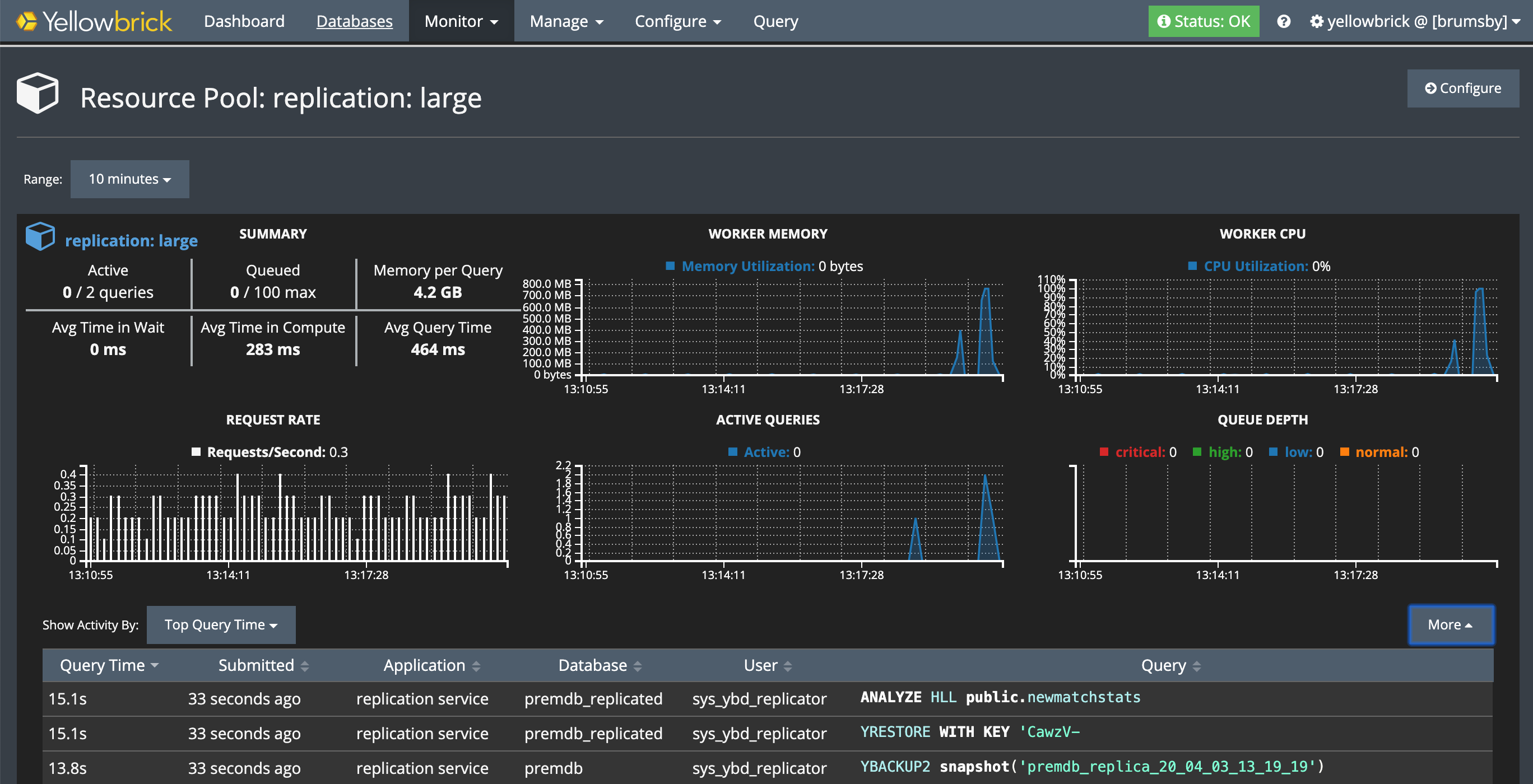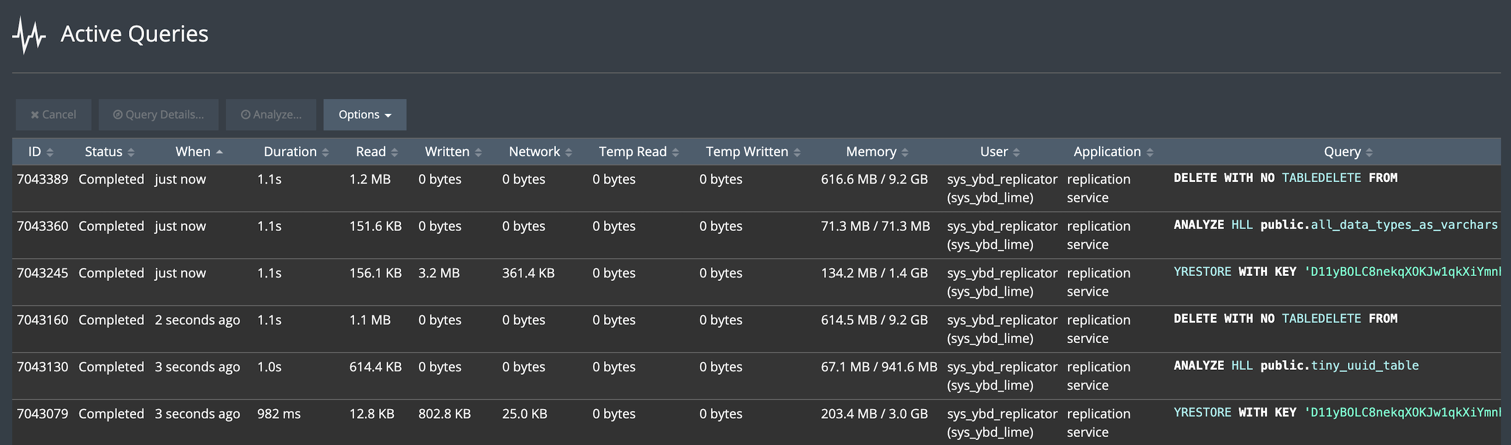 To monitor replication at the table level while replication is in progress (or just completed), go to Monitor > Active Queries, then look for YRESTORE WITH KEY queries for the replication service application. For example:
