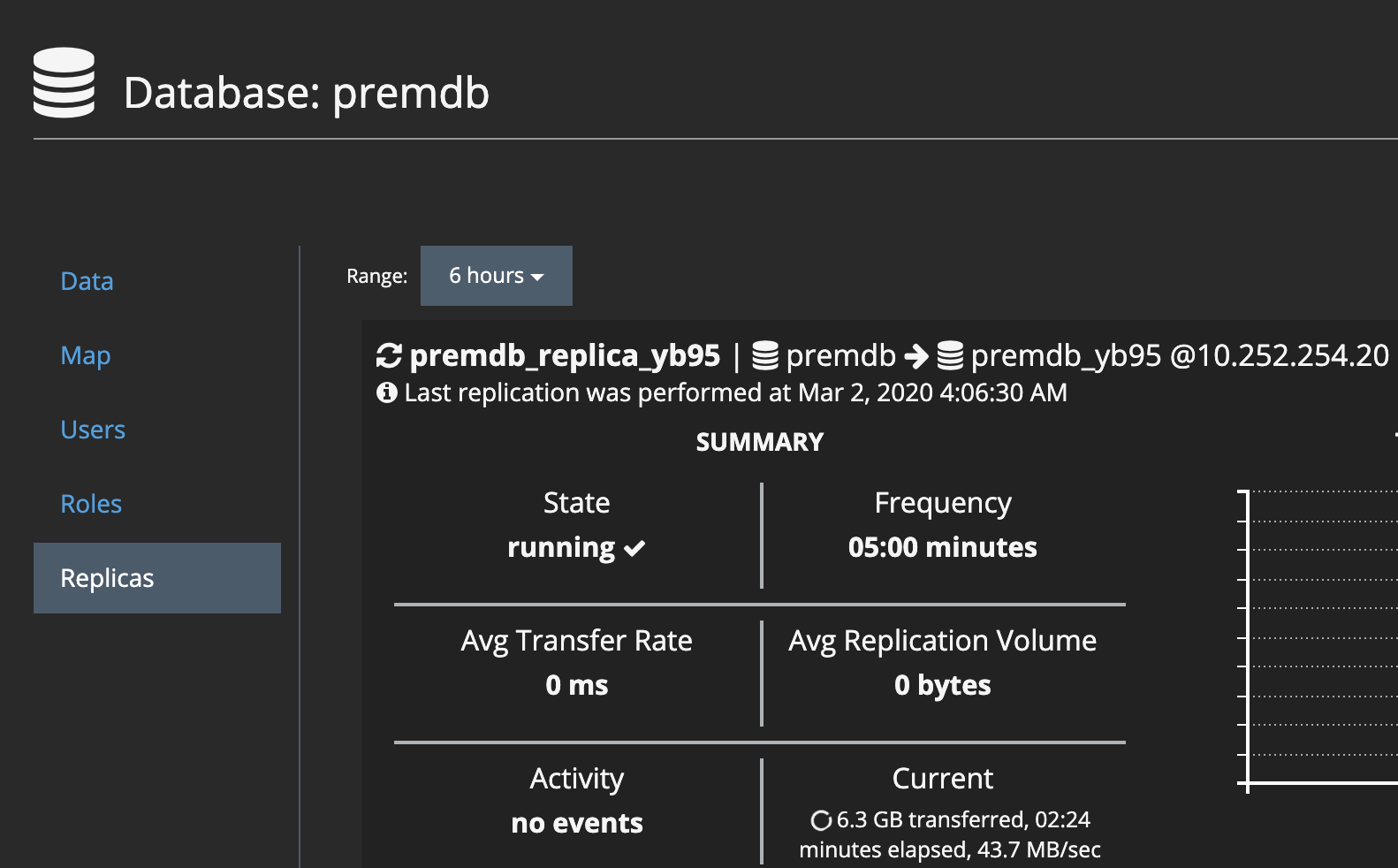 If replication is in progress, you can see the current state of a replication cycle. Select a database that has a replica, then go to the Replicas tab. Note the statistics for the current cycle in the lower-right corner. For example: