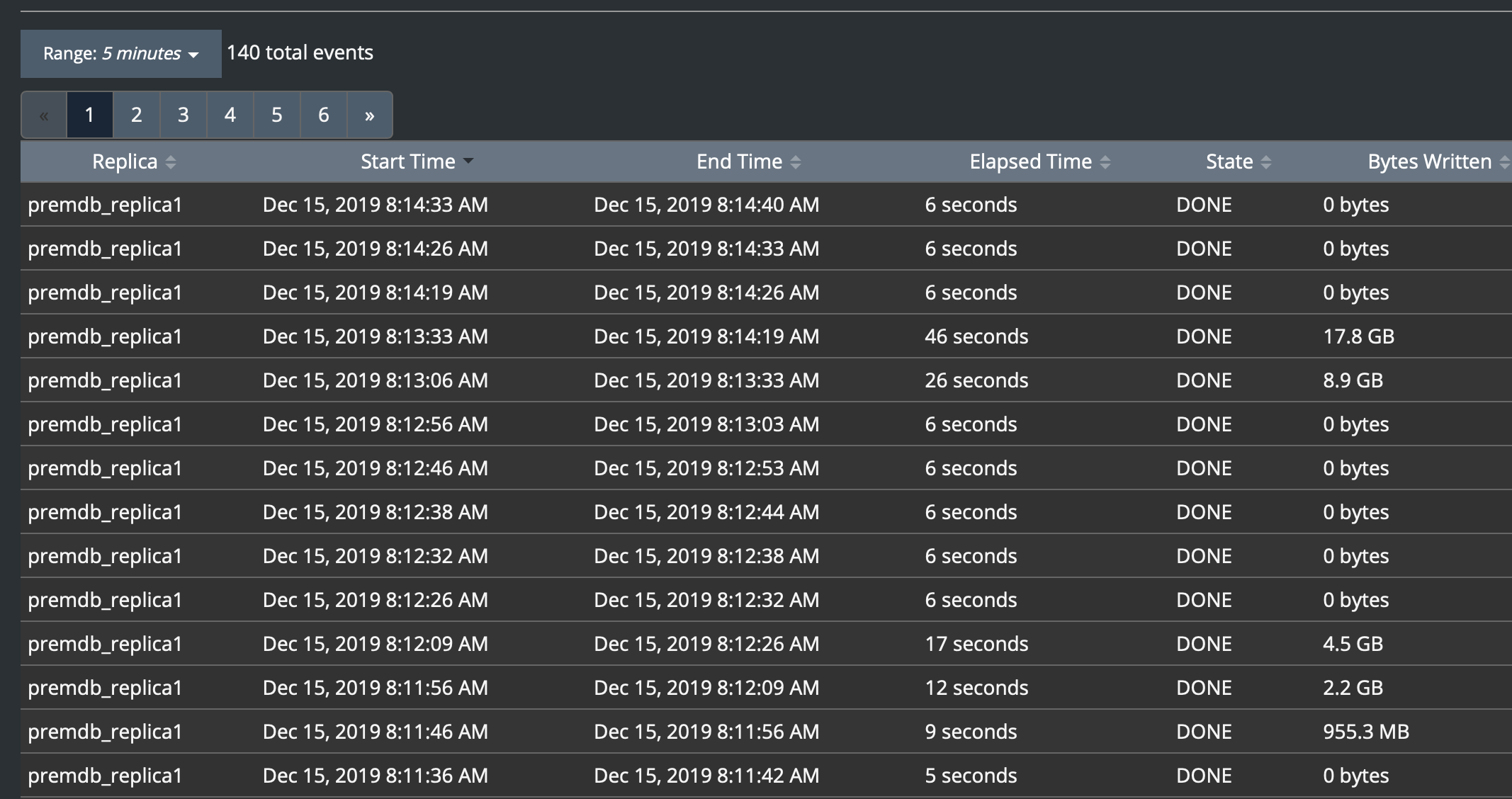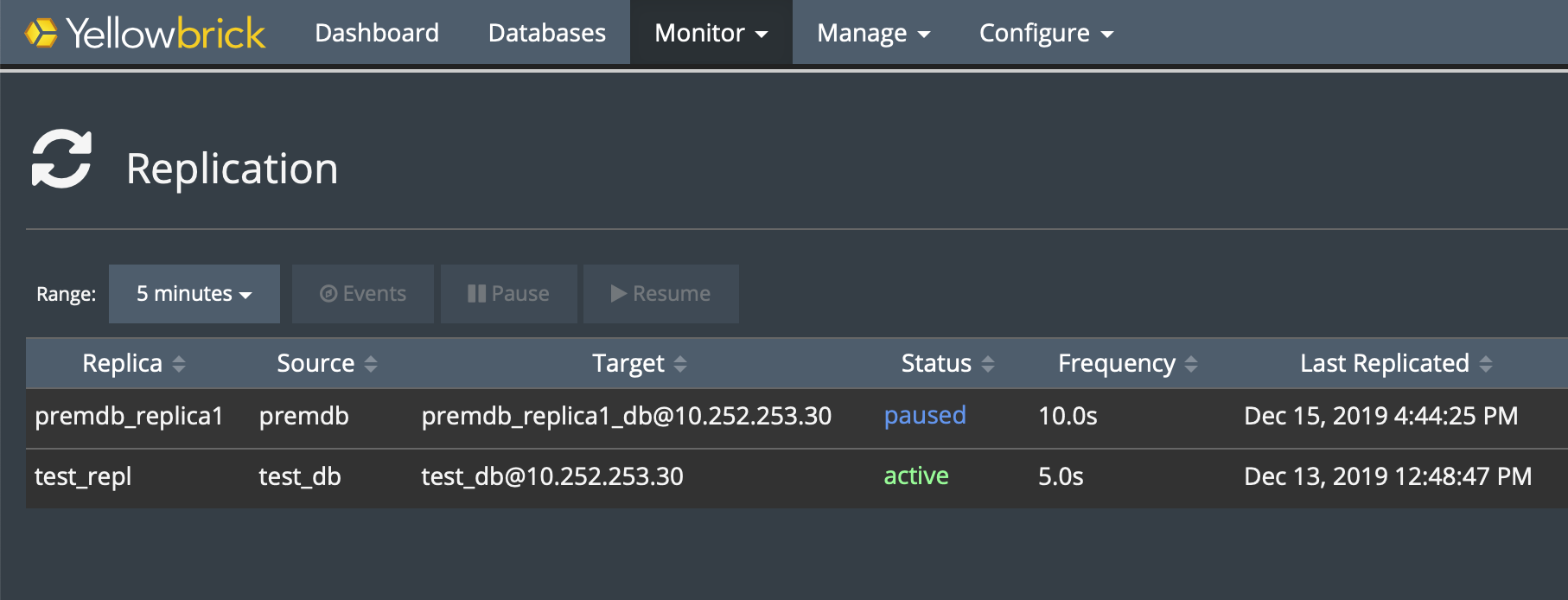 You can filter replication events, as well as pause and resume replication. Too see a full history of replication on a specific replica, select a replica from the list. For example: