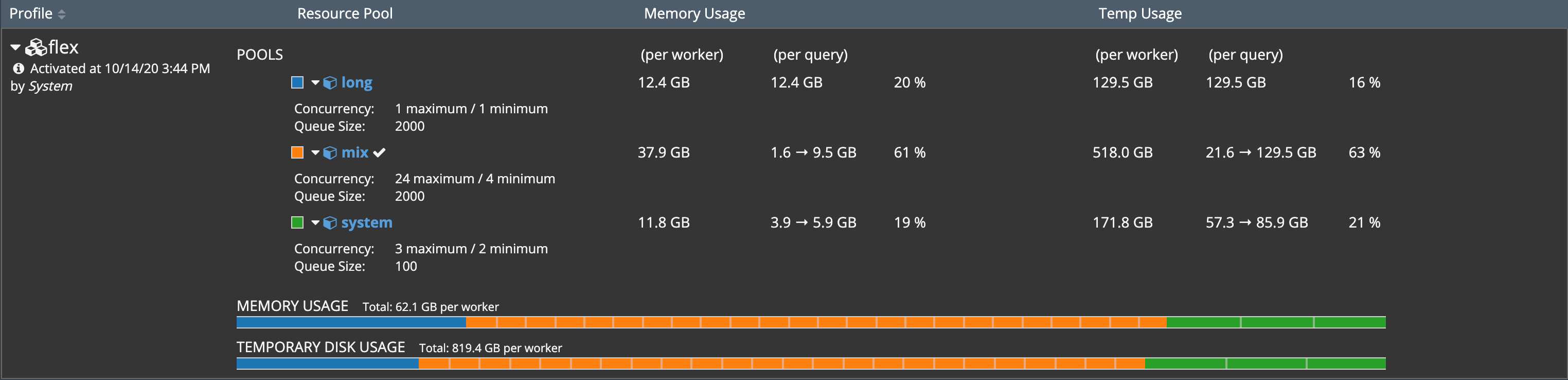 In the example shown here, memory per query/per worker typically flexes between 1.6GB and 9.5GB (1/24 of the available memory up to ¼ of the available memory).