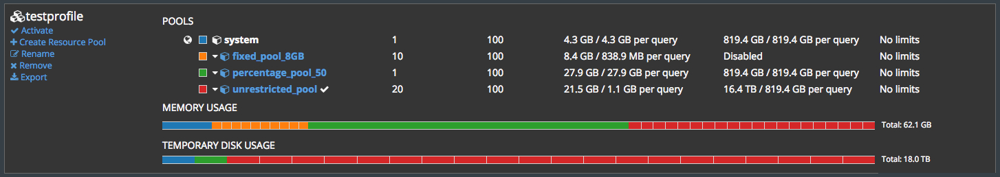 The following images demonstrate memory allocation per worker node on a 15-node cluster. Each worker node has approximately 63GB of memory available (about 1TB total memory for the system). A new WLM profile, testprofile, is created, then associated with some resource pools that have different memory requirements.