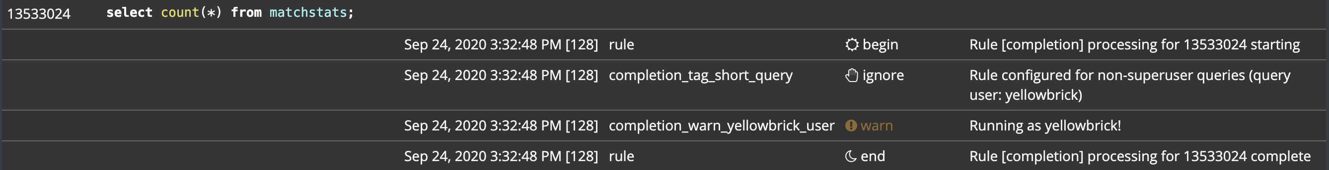 This completion rule, completion_warn_yellowbrick_user, tracks all of the queries run by the yellowbrick account and logs a warning message.