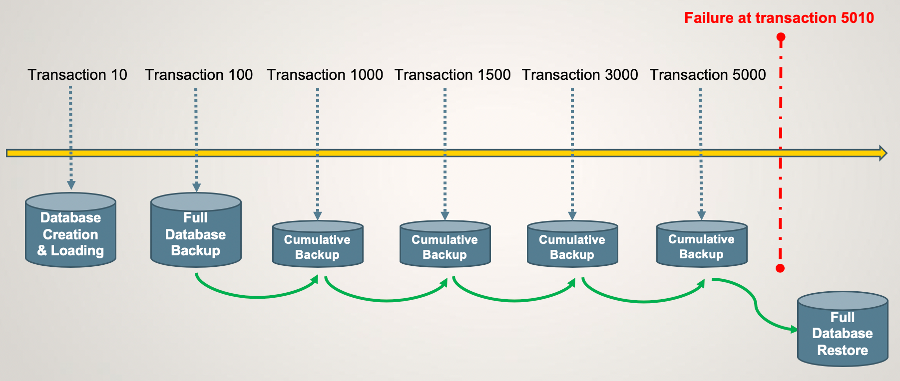 Because only full and cumulative backups are used in this case, the database can be restored from any one of the cumulative backups without compromising subsequent backups in the chain. For example, you could restore to the backup at transaction 1500, then later restore to the backup at transaction 5000 if you needed to do that.