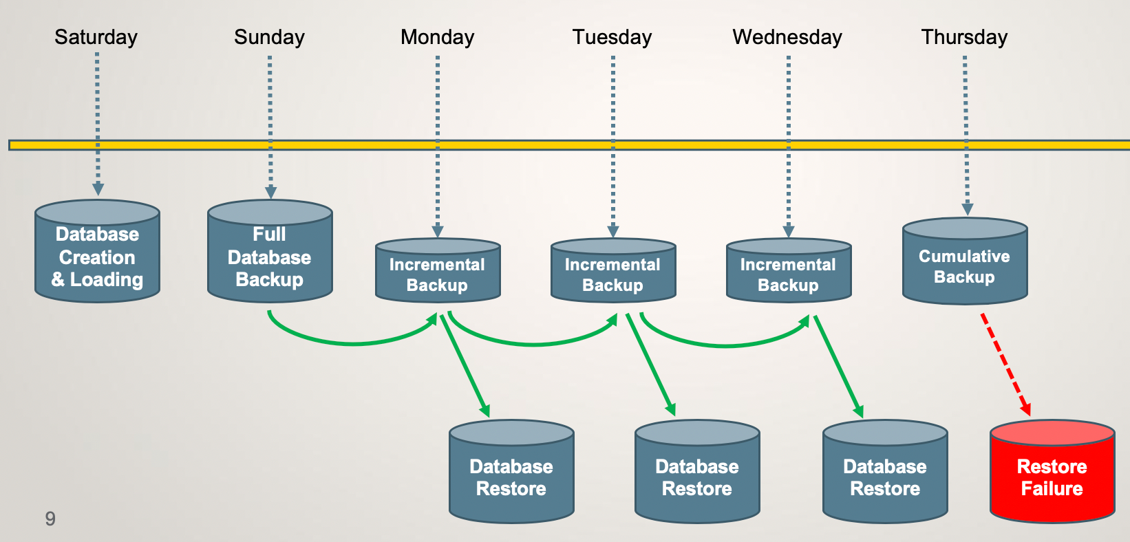 In the third example, a database is being incrementally restored every day. This works fine until a cumulative backup is taken after restores from incremental backups have already occurred. These restores break the restore path for the cumulative backup.