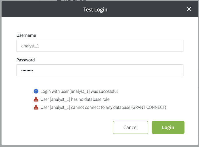 cn=analyst_1,ou=OrgUsers,dc=test,dc=yellowbrick,dc=ioNote that analyst_1 exists only in LDAP. There is no equivalent database user. Therefore, the login is successful, but two warnings are displayed:
