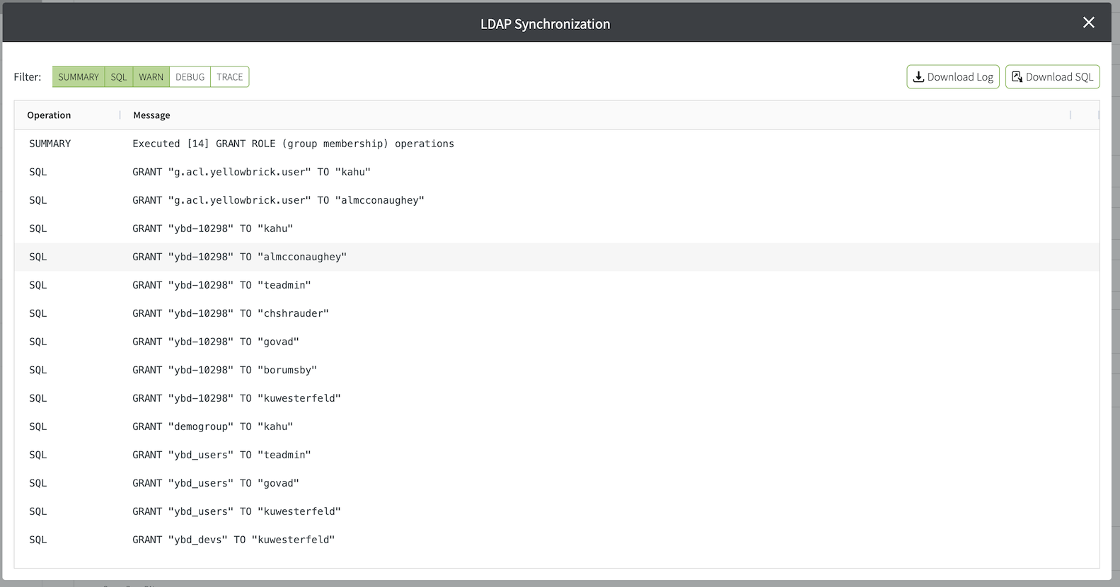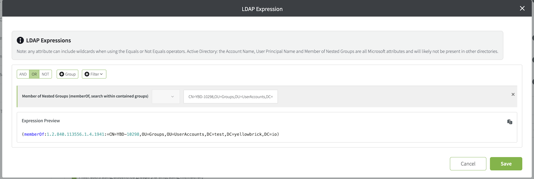 Here is a similar example for the user filter, which looks for all users who are a member of the group yb_all_users or one of its descendant groups (Member of Nested).