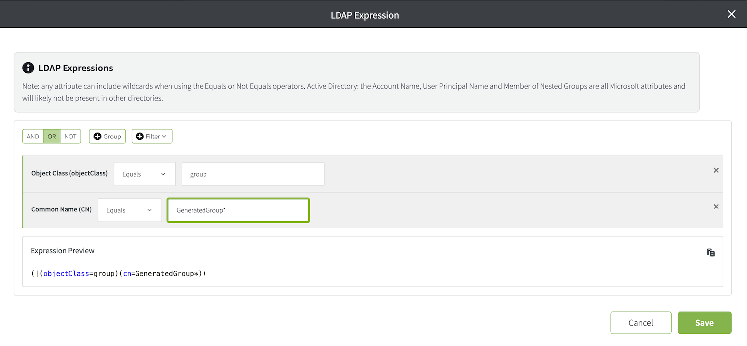 Use the Expression Builder to simplify the process of searching through multiple LDAP groups; click the + Expression button to the right of the two filter fields. This interface provides building blocks for the notation that is commonly used in LDAP searches.