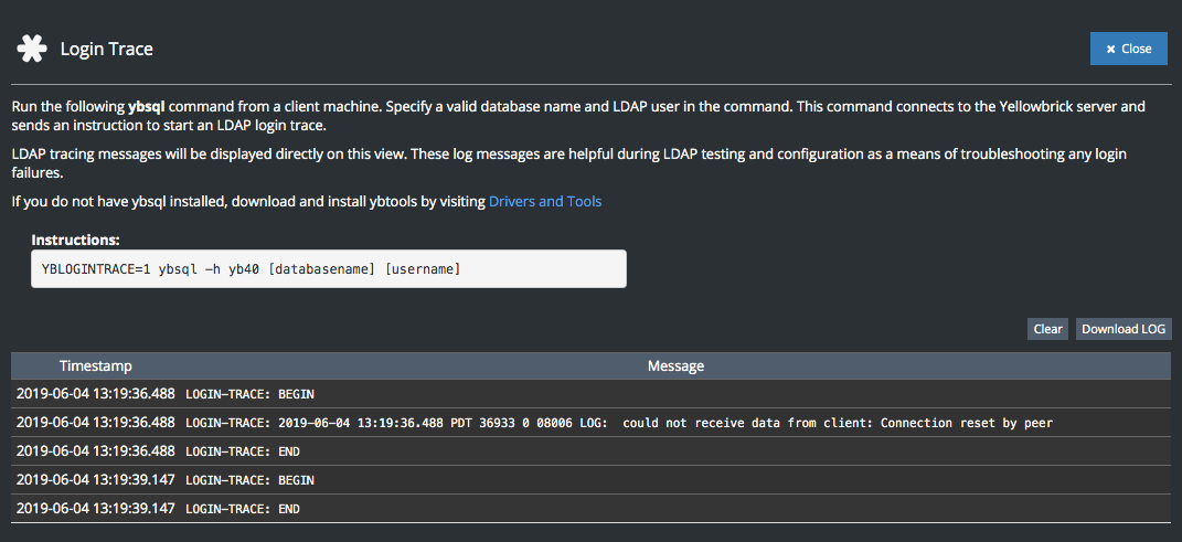Optionally, set up a login trace that runs on the Yellowbrick server and displays messages for LDAP login attempts directly via the SMC. Click Login Trace in the upper right corner of the screen, then run the