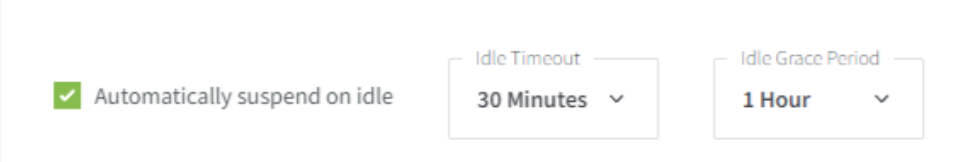 The Idle Timeout value is subject to an additional grace period. For example, if you set Idle Timeout to 30 minutes and Idle Grace Period to 1 hour, the instance will not automatically suspend until an idle time of 90 minutes has passed. The idle timeout is not enforced until the grace period has elapsed.