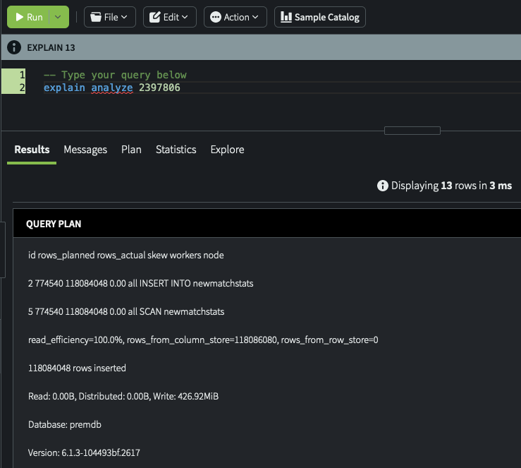 Run the query and return both the query plan and execution details. Runtime statistics are reported, including rows returned, execution time (in milliseconds), memory use, and cache hits. The read efficiency statistic is a percentage that describes how effective the execution engine was in not reading rows from the storage engine early in the plan. A value of 0% means that no rows were discarded in this way. A high value means that the system was very efficient and incurred less I/O. Sorting a table on a column that is frequently constrained may influence read efficiency.