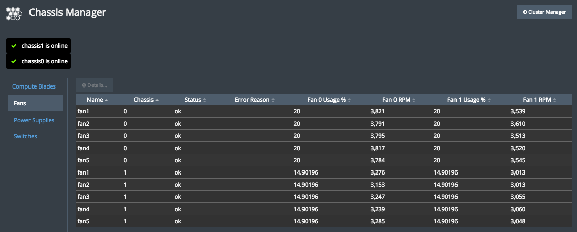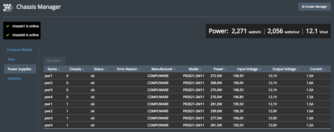 Additionally, the current power consumption of the appliance is summarized at the top of the page. This power consumption is just for the compute blade chassis and does not include power drawn from the two manager nodes.