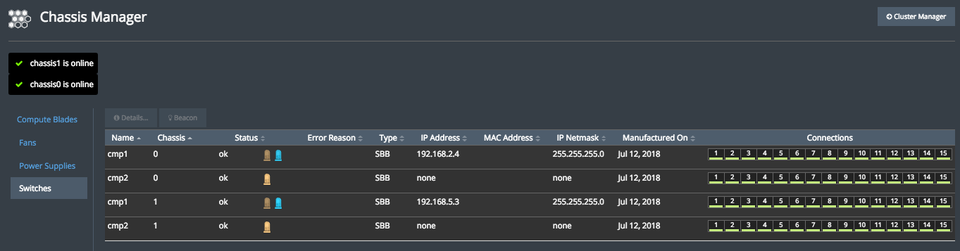 The graphical box below each compute blade (the green boxes in the screen capture) provides information on the software status for each blade. There are two indicators: the color of the box and the icon that is shown.
