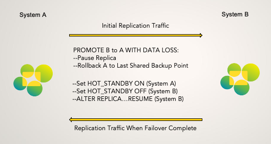 Consider the following example, which describes a failover scenario where data committed to the primary system has not yet been replicated, and the primary system is not responsive (System A = primary, System B = secondary):