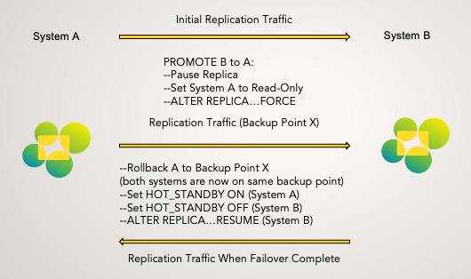 Consider the same scenario without data loss: in this case System A is responsive after the failure occurs, so a replication cycle is feasible as part of the failover operation: