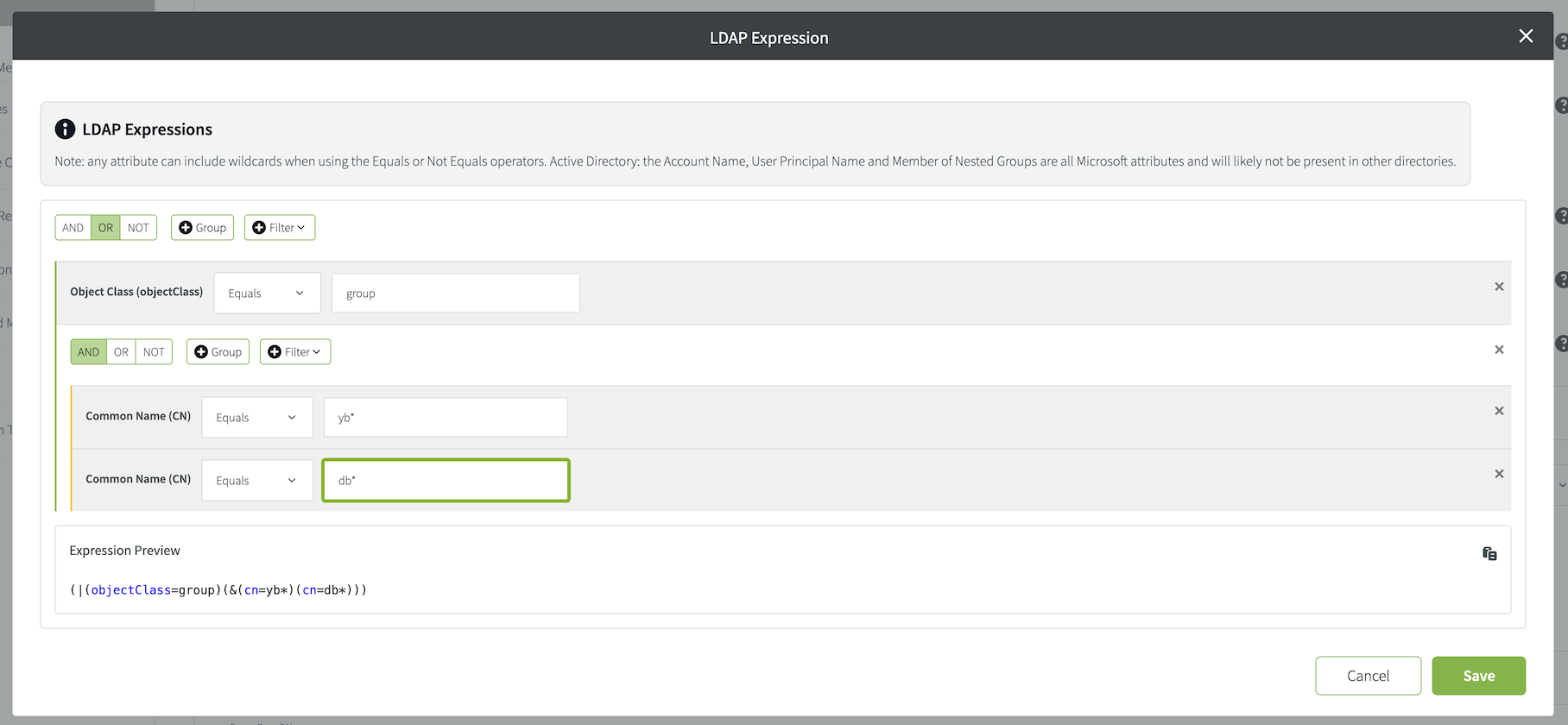 In this case, assume that your organization's LDAP directory contains additional non-Yellowbrick groups under Database/SecurityGroups, such as mstr_users and tableau_users, that you want to filter out during synchronization. To synchronize only those groups whose names begin with yb or db, for example, you can use the LDAP Expression Builder as shown here. (Alternatively, you can construct the expression manually).