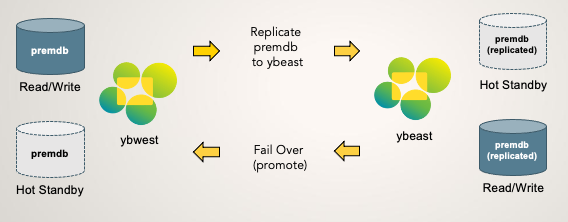 PROMOTE REPLICATo summarize, this command takes the premdb_replicated database out of HOT_STANDBY mode and allows you to start using this database for read and write operations. When the ybwest instance comes back online, replication will proceed in the reverse direction so that the premdb database receives changes from premdb_replicated and can "catch up." For more details about what happens in the background when you run the PROMOTE command, see Fail Over With or Without Data Loss.